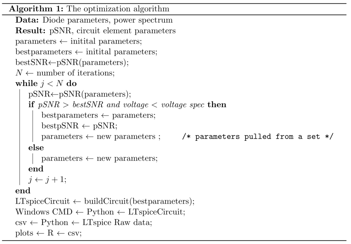The optimization routine is a brute force search at the moment, however it will work well with smarter techniques such as simulated annealing. Also note that although the LTspice run is pushed to the end to simulate the final configuration, it can be pulled into the loop if there is a more complicated circuit to analyze. This might be a good tool for later projects. The optimization returns the best parameters, which are tabulated and compared to the values in the current circuit in Table 2.